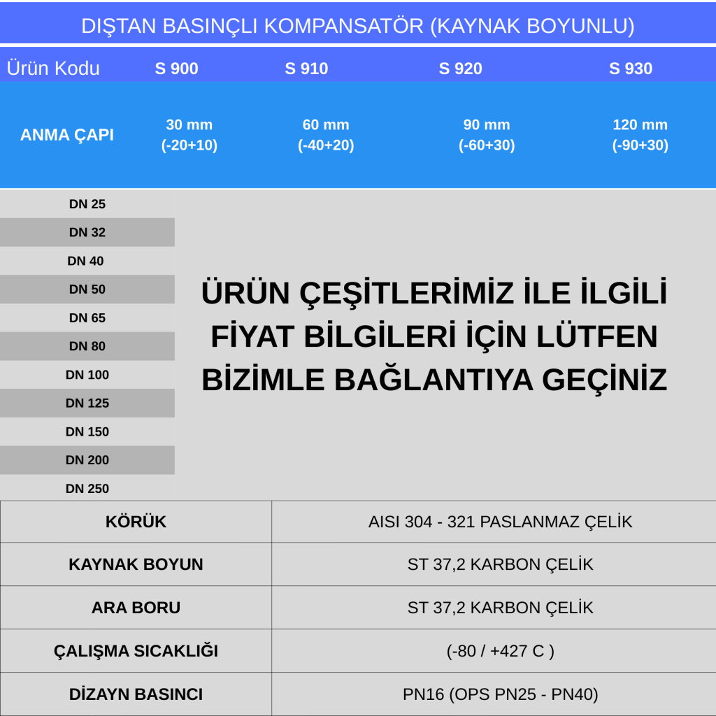 Dıştan basınçlı körük yapısı, basıncın körük stabilitesini artırmasını sağlarken, kaynak boyunlu bağlantı yapısı maksimum mukavemet ve sızdırmazlık sunar.