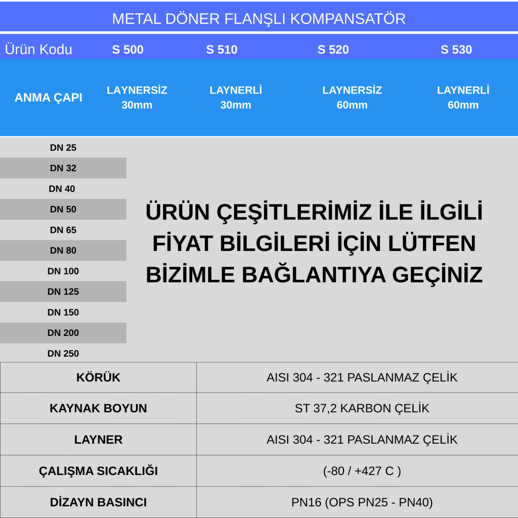 Paslanmaz çelik körük yapısı yüksek dayanım ve uzun ömür sağlarken, döner flanşlı yapısı montaj kolaylığı ve sızdırmaz bağlantı sunar.