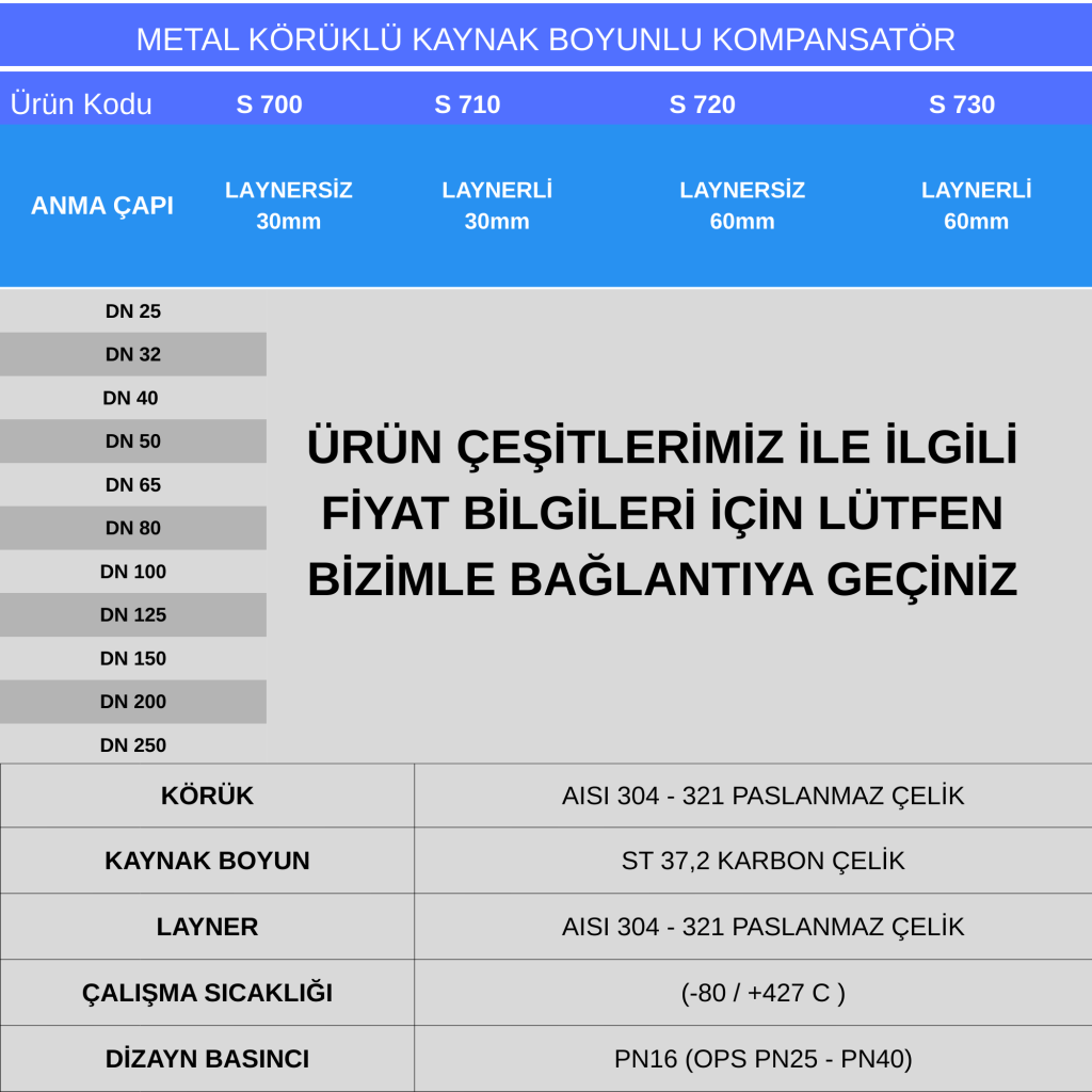 Kaynak boyunlu bağlantı yapısı yüksek mukavemet ve sızdırmazlık sağlarken, paslanmaz çelik körük yapısı uzun ömürlü ve dayanıklı bir kullanım sunar.